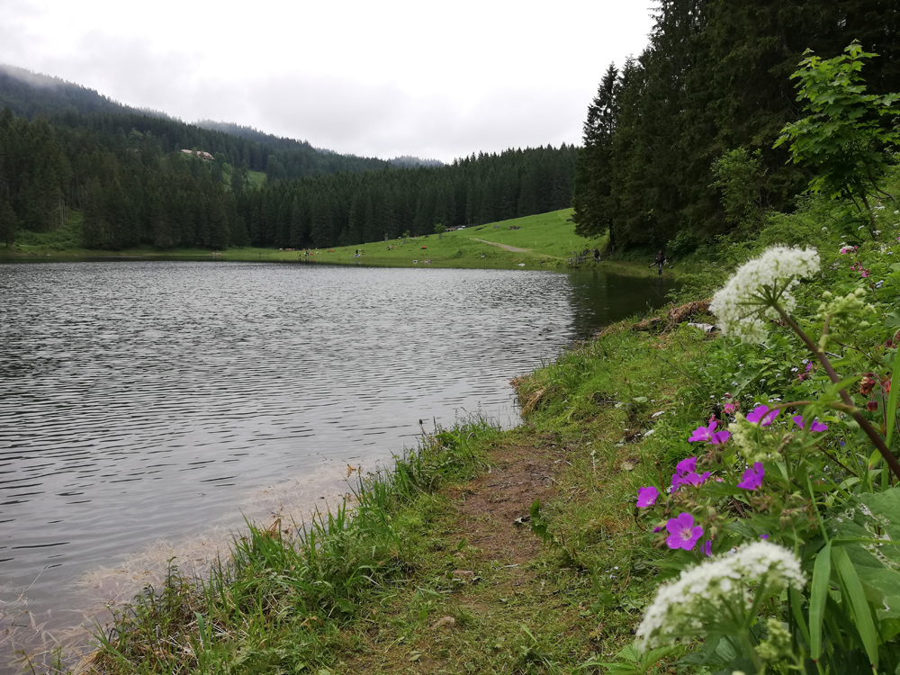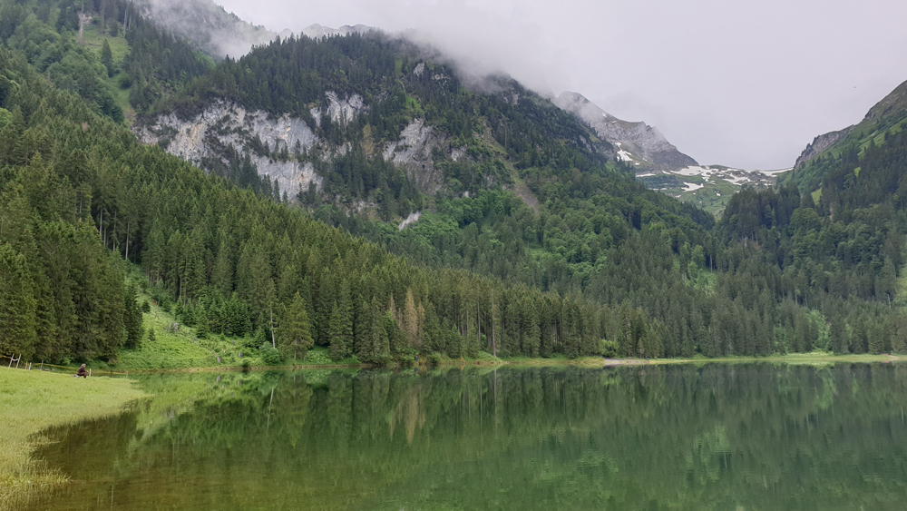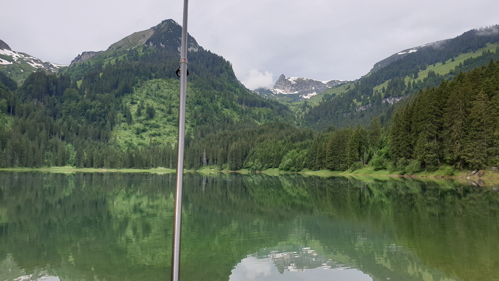 Nach einer gut 70 minütigen Fahrt entlang der schönen Thur traten wir vollgepackt mit der Fischerausrüstung, Holz für die Grillade und Eis für kühle Getränke sowie natürlich auch für die gefangenen Fische, den kurzen Fussmarsch vom öffentlichen Parkplatz zum See an. Zu unserem Glück hatten wir 2 Handwagen dabei, damit wir nichts bei dem Auto zurücklassen mussten. Der traumhaft eingebettete Voralpsee mit Blick auf den Nebel, der den Chäserugg leider verdeckte, liess auf ein wunderbares Fischereierlebnis hoffen. Und so war es dann auch. Das Wetter lud nicht gerade zum Baden ein, aber für unser Vorhaben war es perfekt. Der Regen liess uns ungestört und die Sonne versteckte sich mehrheitlich hinter den Wolken. Somit konnten wir bei angenehmen Temperaturen unsere Würfe tätigen und die Fische waren den ganzen Tag schön in Beisslaune. Dabei störte uns der kurze Wolkenbruch keinesfalls, es waren ja auch nur ganz wenige Regentropfen, die wir im Verlauf des Morgens verspürten. Die Fischerei musste deswegen nicht unterbrochen werden.