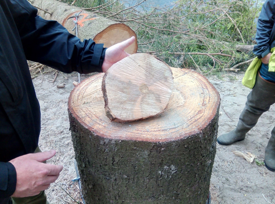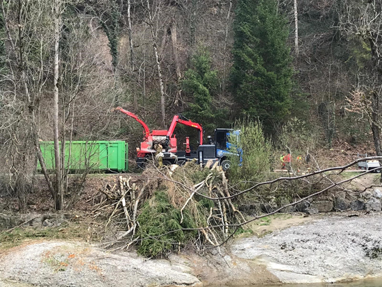 Dieses Risiko ist Dank Fachkräften des kantonalen Forstamtes und den Fischern vom Fischereiverein Thur nun endlich gebannt. Professionelle Gerätschaften und ausgebildetes Fachpersonal lassen diese Masterarbeit direkt einfach aussehen. Die Kettensägen sauber gereinigt und gut geschliffen, liessen diese Eschen kontrolliert und präzise an den richtigen Standort fällen. Es krachte und kurz darauf wurden die Bäume direkt mit der Seilwinde auf die andere Uferseite gezogen, um dort anschliessend mit grossem Lastwagenhäcksler zu Holzschnitzeln verarbeitet zu werden. Eine kantonale Bewilligung für dieses Vorhaben durfte notabene natürlich nicht fehlen. Wir sprechen dafür speziell dem Forstamt Kirchberg und Oberbüren einen grossen Dank aus.