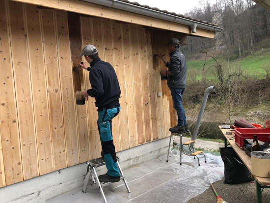 Das Betriebshaus der Hälteranlage Mühlau ist nun seit 2011 im Betrieb und die Holzlasur durfte mit gutem Gewissen erneuert werden. Dazu wurden im ganzen Toggenburg diverse Schleifmaschinentypen zusammengetragen (So kam es einem beim Betracht des Schleifsortiments vor) und so ist dem grosse „Surren“ nichts mehr im Wege gestanden. Es wurde mit viel Präzision und Eifer an den Seitenwänden geschliffen. Ja man kann fast sagen, es gab einen regelrechten Wettbewerb! Der Eifer war derart gross, dass die Schleiftruppe drei Tage nach beenden der Arbeit, immer noch Staub in den Ohren hatte. Unter strenger Anleitung des Malermeisters, wurde die Technik des Holzöls auftragen mittels dem PINSEL (Ein Roller durfte auf keinem Fall verwendet werden) erlernt. Die Gleichmässigkeit bei korrekter Ausführung ist für einen nicht Maler wirklich erstaunlich. Ein Insidertipp: Das Holzöl wird für eine solche Anwendung, der Holzlasur klar vorgezogen. Nussbaumlasur ist schon gar, gänzlich verboten.