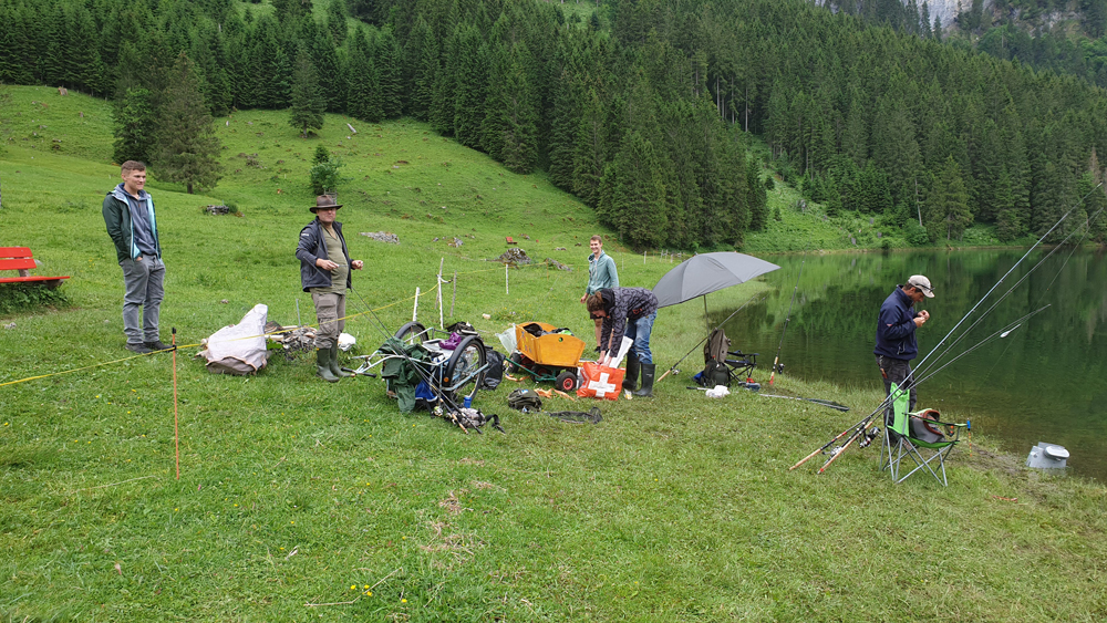 Nach einer gut 70 minütigen Fahrt entlang der schönen Thur traten wir vollgepackt mit der Fischerausrüstung, Holz für die Grillade und Eis für kühle Getränke sowie natürlich auch für die gefangenen Fische, den kurzen Fussmarsch vom öffentlichen Parkplatz zum See an. Zu unserem Glück hatten wir 2 Handwagen dabei, damit wir nichts bei dem Auto zurücklassen mussten. Der traumhaft eingebettete Voralpsee mit Blick auf den Nebel, der den Chäserugg leider verdeckte, liess auf ein wunderbares Fischereierlebnis hoffen. Und so war es dann auch. Das Wetter lud nicht gerade zum Baden ein, aber für unser Vorhaben war es perfekt. Der Regen liess uns ungestört und die Sonne versteckte sich mehrheitlich hinter den Wolken. Somit konnten wir bei angenehmen Temperaturen unsere Würfe tätigen und die Fische waren den ganzen Tag schön in Beisslaune. Dabei störte uns der kurze Wolkenbruch keinesfalls, es waren ja auch nur ganz wenige Regentropfen, die wir im Verlauf des Morgens verspürten. Die Fischerei musste deswegen nicht unterbrochen werden.