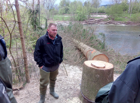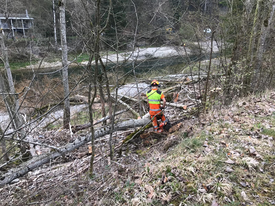 Dieses Risiko ist Dank Fachkräften des kantonalen Forstamtes und den Fischern vom Fischereiverein Thur nun endlich gebannt. Professionelle Gerätschaften und ausgebildetes Fachpersonal lassen diese Masterarbeit direkt einfach aussehen. Die Kettensägen sauber gereinigt und gut geschliffen, liessen diese Eschen kontrolliert und präzise an den richtigen Standort fällen. Es krachte und kurz darauf wurden die Bäume direkt mit der Seilwinde auf die andere Uferseite gezogen, um dort anschliessend mit grossem Lastwagenhäcksler zu Holzschnitzeln verarbeitet zu werden. Eine kantonale Bewilligung für dieses Vorhaben durfte notabene natürlich nicht fehlen. Wir sprechen dafür speziell dem Forstamt Kirchberg und Oberbüren einen grossen Dank aus.