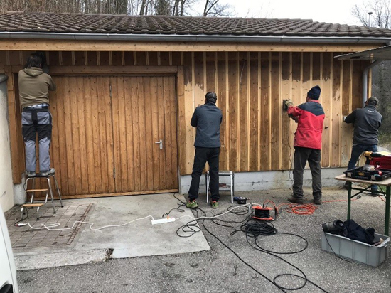Das Betriebshaus der Hälteranlage Mühlau ist nun seit 2011 im Betrieb und die Holzlasur durfte mit gutem Gewissen erneuert werden. Dazu wurden im ganzen Toggenburg diverse Schleifmaschinentypen zusammengetragen (So kam es einem beim Betracht des Schleifsortiments vor) und so ist dem grosse „Surren“ nichts mehr im Wege gestanden. Es wurde mit viel Präzision und Eifer an den Seitenwänden geschliffen. Ja man kann fast sagen, es gab einen regelrechten Wettbewerb! Der Eifer war derart gross, dass die Schleiftruppe drei Tage nach beenden der Arbeit, immer noch Staub in den Ohren hatte. Unter strenger Anleitung des Malermeisters, wurde die Technik des Holzöls auftragen mittels dem PINSEL (Ein Roller durfte auf keinem Fall verwendet werden) erlernt. Die Gleichmässigkeit bei korrekter Ausführung ist für einen nicht Maler wirklich erstaunlich. Ein Insidertipp: Das Holzöl wird für eine solche Anwendung, der Holzlasur klar vorgezogen. Nussbaumlasur ist schon gar, gänzlich verboten.